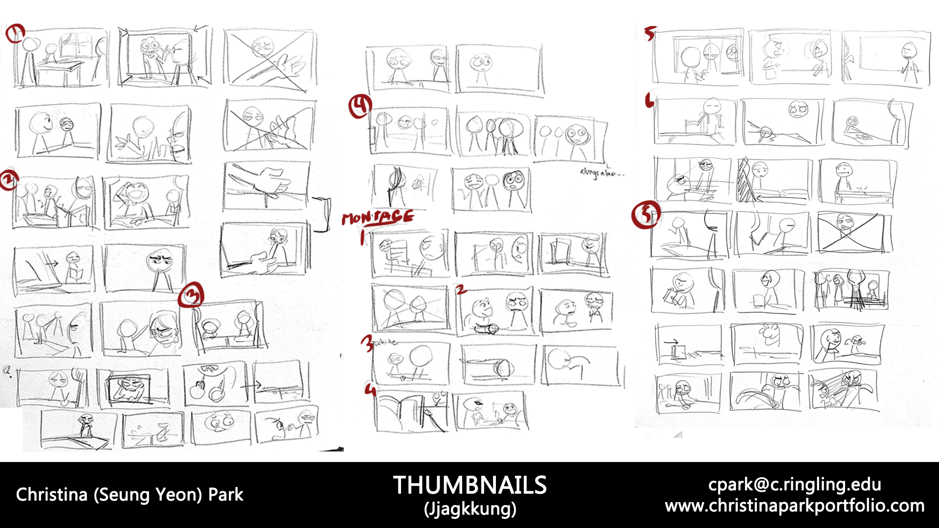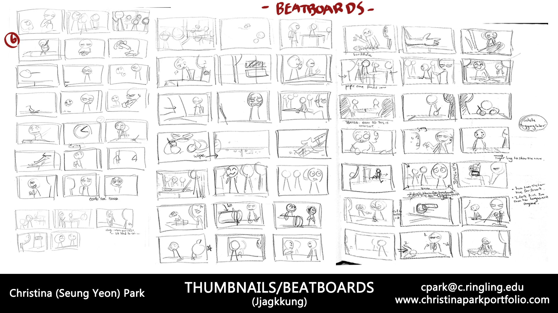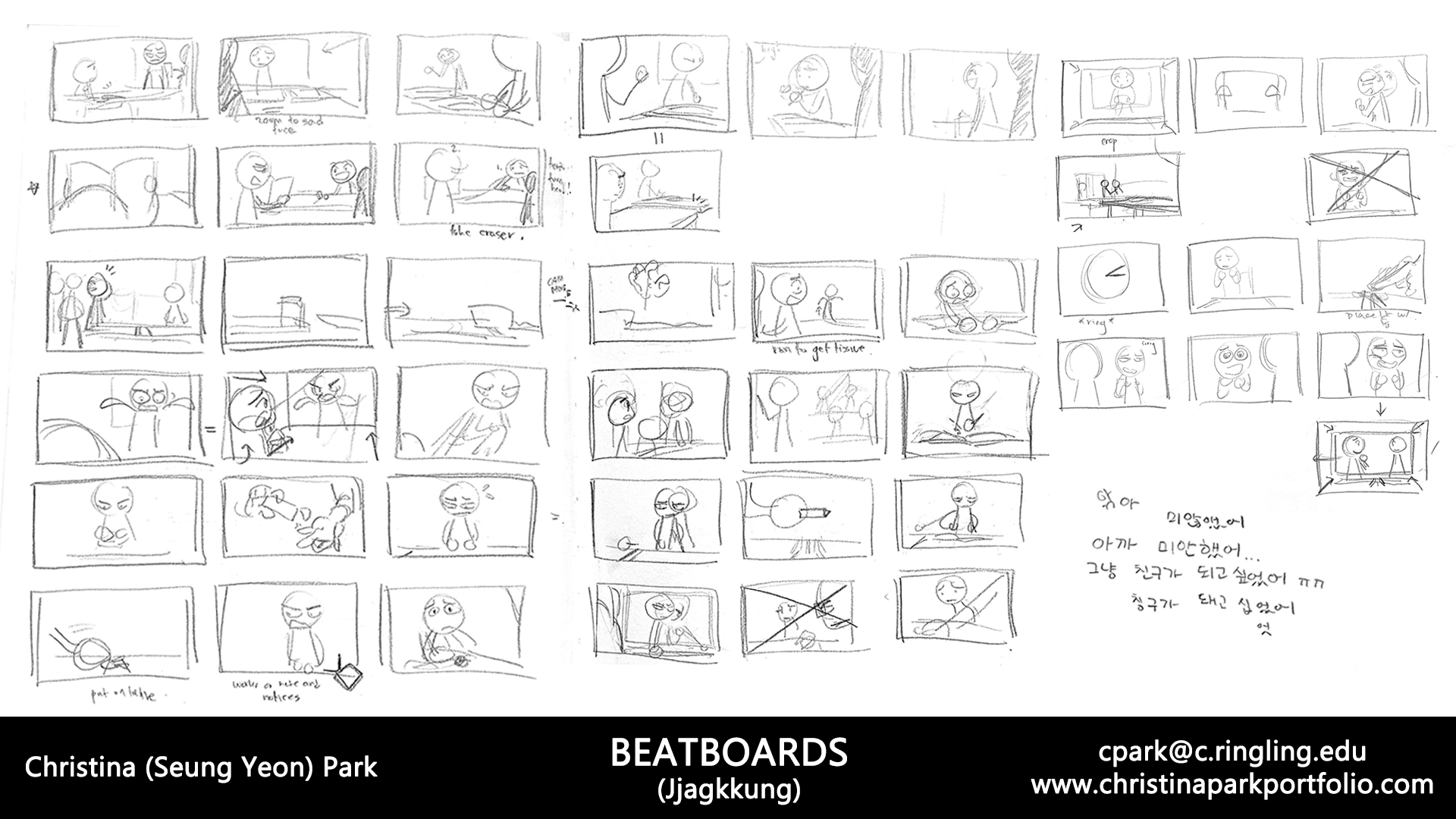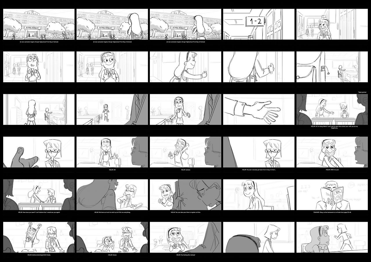 박승연: 학교에서는 주로 컴퓨터 애니메이션에 집중적으로 교육을 하기 때문에, 스토리보드에 대한 교육은 상대적으로 적은 편입니다. 물론 관련 수업은 있지만, 주로 스토리를 짜는 과정에 더 많은 시간을 할애합니다. 그래서 저는 스토리보드를 더 잘하기 위해 방학 때마다 온라인 수업을 듣고, 업계에 계신 스토리 아티스트들에게 연락하여 피드백을 받으려고 하고 있습니다. 지금금도 계속 그러고 있구요.